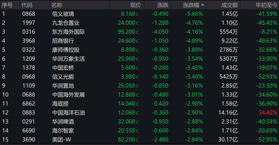 信义玻璃跌5.66%,九龙仓置业跌4.76%,东方海外国际跌4.16%,领跌蓝筹。