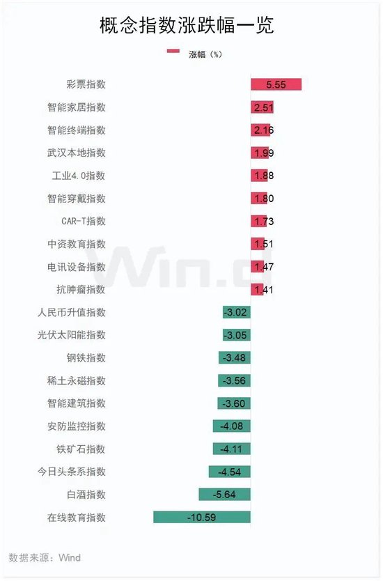涨幅方面,彩票指数涨5.55%,智能家居指数涨2.51%,智能终端指数涨2.16%。