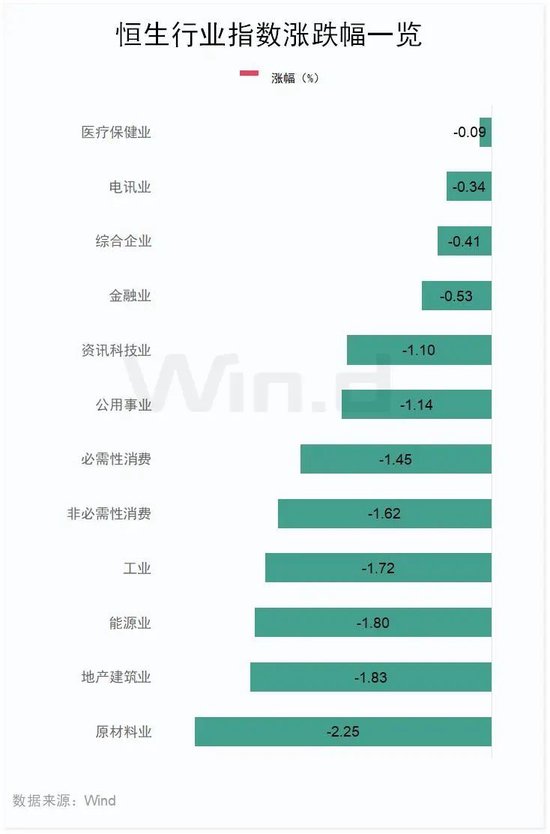 12月13日,恒生行业指数全线下跌。原材料行业指数跌2.25%,地产建筑行业指数跌1.83%,能源行业指数跌1.8%。