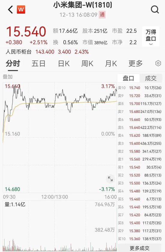 12月13日,小米集团逆势上涨,最大涨幅达3.17%,全日收于15.54港元,涨2.51%。该股近一个月累计涨9.28%。