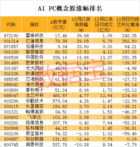 二级市场表现来看,12月以来,AI PC概念股平均涨幅达到9.2%,远超同期上证指数。雷神科技、亿道信息、泓禧科技、智微智能、中国软件、思泉新材累计涨幅超10%;其中雷神科技累计涨幅39.68%排在第一位。
