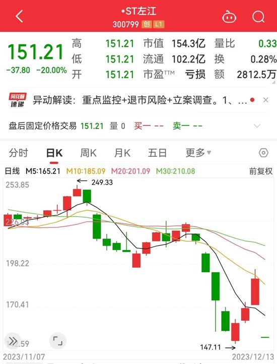 经营业绩低迷,*ST左江二级市场的股价表现令人咋舌。2023年7月14日,该股创下历史高点299.8元/股,创造A股市场ST股最高价纪录,短短2年内,最大涨幅超8倍。截至目前,公司A股市值154.3亿元,A股市值排在ST板块前五位,最新收盘价较历史高点回撤49.56%。
