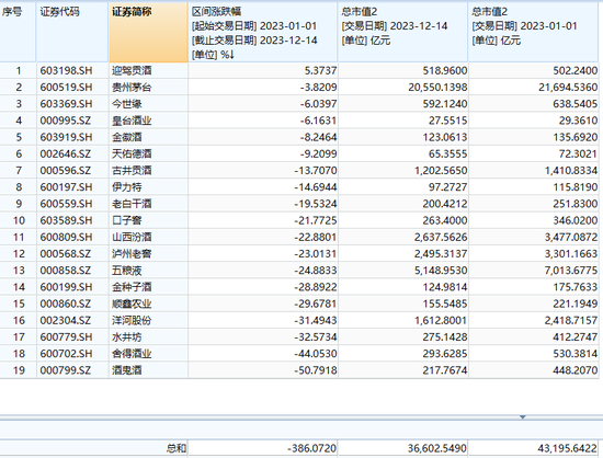 Wind数据显示,2023年以来,除迎驾贡酒外,其余18只白酒股均下跌,酒鬼酒股价腰斩,舍得酒业累跌44.05%,水井坊、洋河股份均跌超30%。整体看,2023年内,A股白酒股总市值由43195.64亿元下降至36602.55亿元,缩水6593.1亿元。