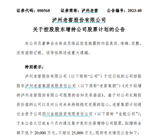 14日晚间,泸州老窖公告,基于对公司长期投资价值的认可以及对公司未来持续稳定发展的信心,老窖集团计划通过全资子公司四川金舵投资有限责任公司(下称“金舵公司”),于公告之日起6个月内通过集中竞价交易增持公司股票,拟增持金额不低于2亿元,不超过2.50亿元。