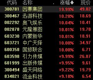 截至午盘,因赛集团20%涨停,迅游科技涨超10%,奥飞娱乐、元隆雅图、内蒙新华等多股涨停。
