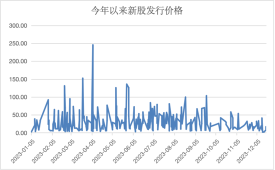 在新股发行市盈率走低的同时,新股发行价格也明显下降。证券时报记者观察发现,今年前三季度发行的新股中,时常出现百元新股,但四季度后,百元新股消失,发行价超50元的新股也仅有个位数。