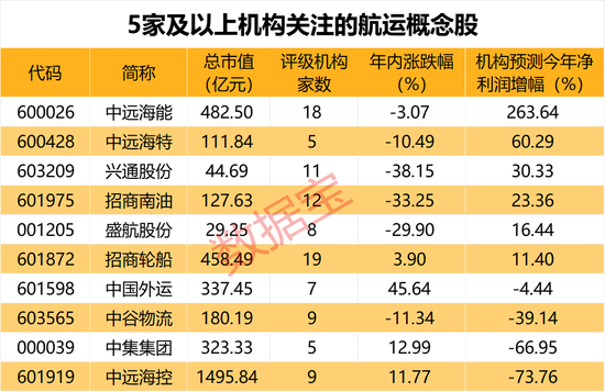 在获得超5家机构给予评级的航运概念股中,机构一致预测中远海能、中远海特、兴通股份等6股2023年业绩有望呈现增长。