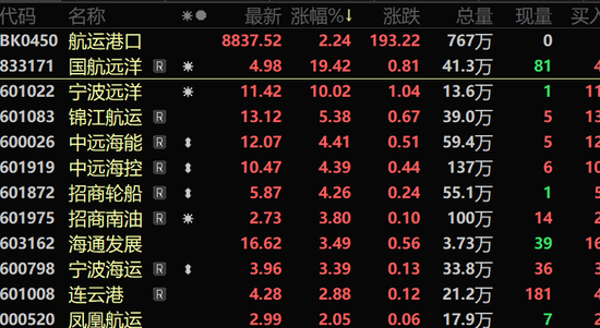 早盘航运概念一度上涨4.72%,领涨两市,宁波远洋、中创物流涨停。