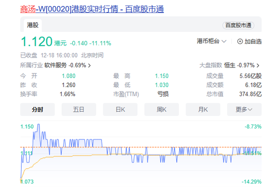 AI龙头商汤-W(00020.HK)今日大幅跳水,盘中一度跌超18%。截至收盘,该股跌逾11%报1.12港元,最新市值375亿港元。
