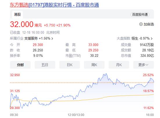 东方甄选(01797.HK)今日高开高走,盘中大涨近26%,截至收盘,该股上涨21.9%报32港元,最新市值325亿港元。