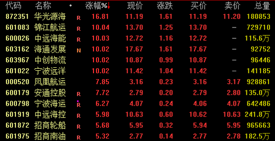 航运板块今日大幅走高,截至收盘,华光源海涨近17%,盘中一度大涨逾29%;宁波远洋、锦江航运、中远海能、海通发展、中创物流等涨停。