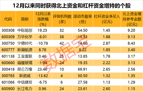 数据宝统计显示,12月以来,获得北向资金增持超过亿元(按照12月以来成交均价计算)同时获得杠杆资金净增持超过亿元的个股,合计只有10只。其中,中际旭创、万华化学、宁德时代等北上资金增持超过8亿元;宁德时代、福耀玻璃、昆仑万维、长江电力等杠杆资金净增持超过2亿元。