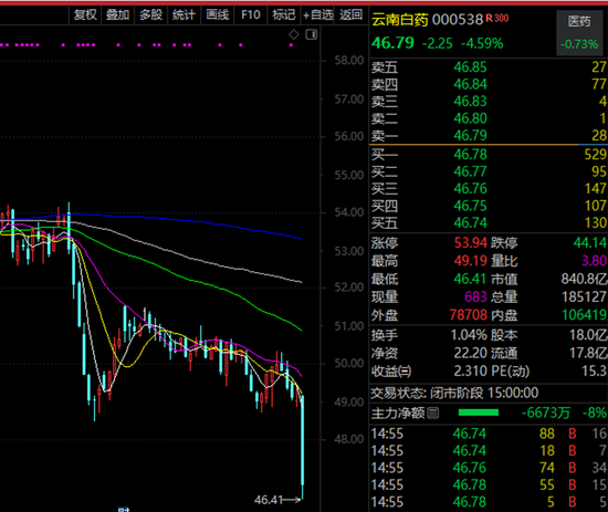 12月19日,云南白药小幅高开后不断下挫,盘中最低跌至46.41元,创出本轮调整新低。截至收盘,该股下跌4.59%,总市值已不足850亿元。云南白药股价调整幅度较大, 此前最高价超111元(复权后),相比最新价回调幅度已超56%。