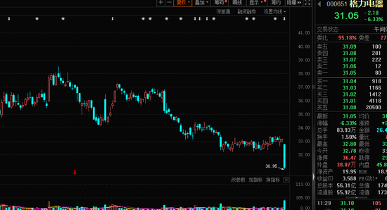 又一只超级大白马股创出年内新低。早盘格力电器一度跌破31元大关,上午收盘下跌6.33%,创出年内新低。