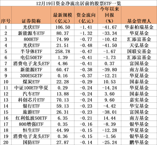 从资金净流出排行看,12月19日,光伏、新能源车、半导体、电信、消费电子等热门细分赛道ETF产品占据主力,此外,个别800ETF、中证100ETF当日资金净流出同样居前。其中,华泰柏瑞光伏ETF单日资金净流出最多,达1.41亿元。紧随其后的是华夏新能源车ETF单日“失血”超1.32亿元。