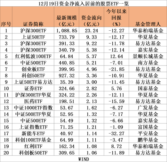 记者注意到,不少头部基金公司旗(金麒麟分析师)下ETF产品净流入明显,如易方达在12月19日合计资金净流入22亿元,强悍吸金。其中易方达沪深300ETF和易方达创业板ETF当日分别净流入9.2亿元、5.0亿元,这两只ETF产品合计总规模超400亿,分别达到404亿元(含场外)、400亿元,易方达上证50ETF、易方达沪深300医药卫生ETF、易方达上证科创板50ETF净流入也分别达到3.0亿元、2.1亿元、1.1亿元。