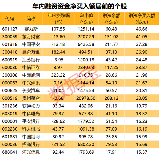 数据宝统计,32股年内融资净买入额超10亿元。赛力斯的融资净买入额最高,年内获得46.66亿元融资净买入;东方财富次之,年内融资净买入额达41.05亿元。还有中国平安、昆仑万维、江苏银行、中信证券等融资净买入额居前,但均未超过30亿元。