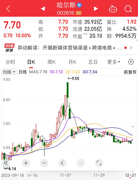 哈尔斯股价一字涨停,报收7.7元,总市值35.92亿元。昨日公司公告称,公司及子公司拟以自有资金开展新媒体营销渠道建设(包括短剧视频、AI数字人、影视动漫及其IP合作等),助力品效销一体化发展,第一期计划投入人民币500万元至1000万元,并根据第一期项目实施效果推进后续工作,预计总投入不超过人民币5000万元。