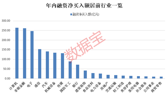 分行业来看,今年以来,申万一级行业中,7个行业的融资资金净买入额超百亿元,计算机、非银金融、电子行业的融资净买入额居前,分别达264.96亿元、261.62亿元和247.9亿元。相比之下,有色金属、农林牧渔、基础化工等6个行业的融资净卖出额均超10亿元。