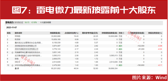 与此同时,个人投资者中,超级牛散陈发树的“新水股”也在提前“揭开面纱”。11月14日,雷电微力发布公告,以公司11月7日登记在册的数据显示,陈发树继续稳居公司第二大股东,1565.92万股的持仓与三季度末持平(见图7)。