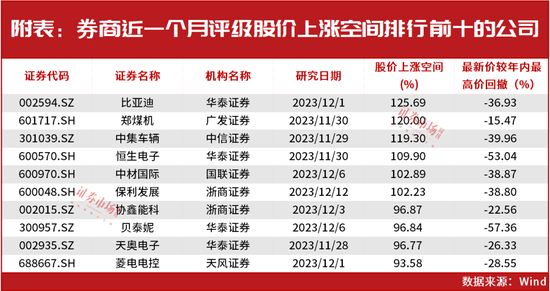 但实际上,在同期有部分上市公司获得了上涨空间更高的目标价。Wind统计,目前有多家公司的最新收盘价相对于券商的目标价有超过50%的上涨空间,其中比亚迪、郑煤机和中集车辆等6家公司的股价上涨空间超过100%(见附表)。而与金域医学等相似的是,这些公司在今年以来均股价缩水严重,其中部分公司更是超过50%。