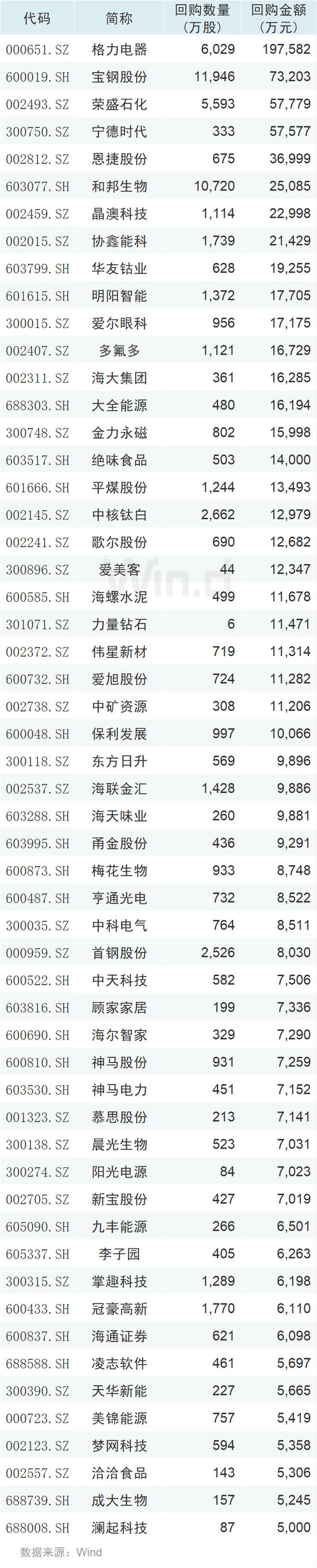 12月以来,市场连续回调,不少公司股价持续下跌后,估值吸引力进一步增加,从而更加坚定了上市公司回购的意愿。Wind统计显示,12月以来,有400多家公司参与回购,累计回购金额超120亿元。其中,格力电器回购金额近20亿元,位居首位;宝钢股份、荣盛石化、宁德时代、恩捷股份、和邦生物、晶澳科技、协鑫能科、华友钴业、明阳智能、爱尔眼科、多氟多、海大集团、大全能源、金力永磁、绝味食品、平煤股份、中核钛白、歌尔股份、爱美客、海螺水泥、力量钻石等公司回购金额超1亿元。