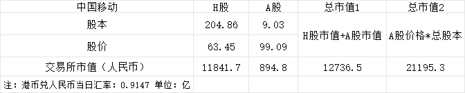 中国移动在H股上市股本占204亿股,占总股本的95%,在A股上市的总股本只有9.03亿股,然而,中国移动H股估值相对较低,因此两者计算方式结果有不小的差距。