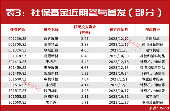 如12月22日,达利凯普披露了首发配售投资者名单,其中,即有多只社保基金现身其中。另据Wind不完全统计显示,2023年四季度以来,包括社保基金16051组合、404组合、1804组合以及503组合等在内的70余只社保基金均现身参与首发打新。部分社保基金获配金额较高,以社保基金404组合为例,其四季度累计获配30次,获配相关公司包括永达股份、夏厦精密、联域股份等(见表3),累计获配金额为178.10万元。