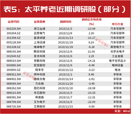 进一步来看,太平养老也表现出了对一些行业的偏爱,如汽车产业链以及半导体等领域(见表5)。以汽车产业链来看,11月以来即有包括星源卓镁、亚太科技、云意电气、上海沿浦、浙江仙通、维峰电子、翔丰华等在内的近10家汽车产业链公司获得其调研关注。
