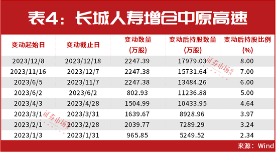 据中原高速近日公告称,收到持股5%以上的股东长城人寿发来的《关于增持股份情况的告知函》,获悉其于2023年12月8日至12月18日增持公司股份2247万股,占公司总股本1.00%。曾于今年6月,长城人寿对中原高速的持仓即达到了5%的举牌线,在此之后,又接连进行了多个“1%”增持。截至目前,长城人寿持仓中原高速占比已增至8%(见表4)。
