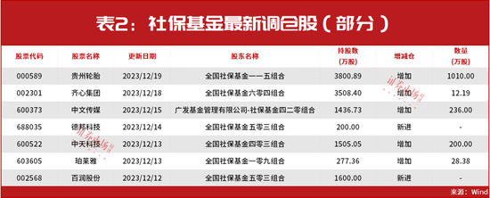 除了中天科技,社保基金也对其他多家公司进行了增仓。在贵州轮胎披露的截至12月19日的股东持仓中,全国社保基金一一五组合即对其增仓1010万股至3800.89万股。今年三季度末,一一五组合即以新进姿态现身成为贵州轮胎第三大流通股股东,当时持仓2790.89万股。另外,在齐心集团、德邦科技披露的最新股东持仓中,也同样有社保基金增仓或新进现身的身影(见表2)。