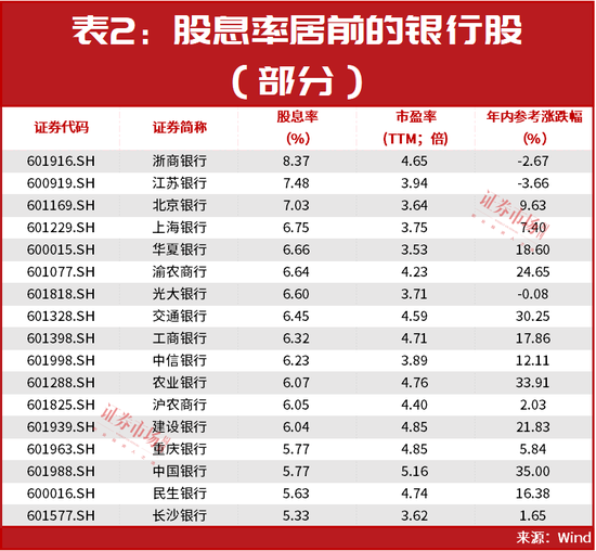 与煤炭类似,不少具有“高股息”特征的银行股也同样走出了“慢牛”行情。统计40余只银行股来看,当前约7成标的股息率超过5%,浙商银行、兴业银行、江苏银行、南京银行、北京银行、成都银行等均超过6%。从二级市场表现来看,不少个股在今年以来迎来逆市上涨,如渝农商行、交通银行、农业银行、建设银行、中国银行等,年内涨幅均超过了20%。与此同时,银行股也同时具有低估值的特征,多数银行股目前的估值均在5倍以下(见表2)。