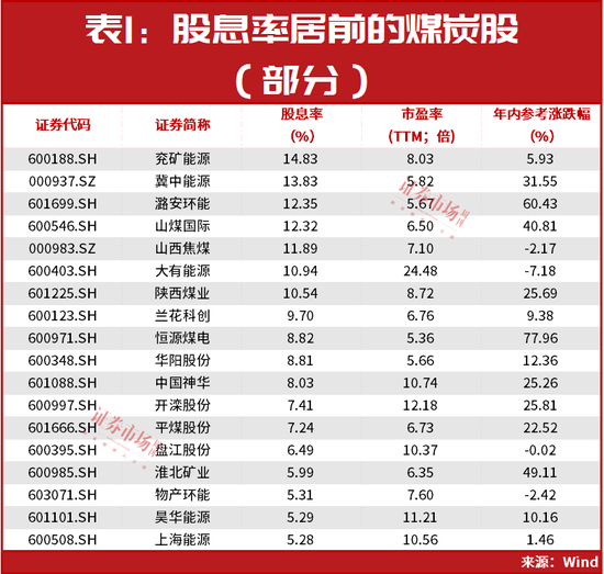 进一步来看,统计近40只煤炭股显示,其中有27只股推出了2022年度的分红方案,17只股息率在7%以上,部分个股则超过10%,如兖矿能源、冀中能源(维权)、潞安环能、山西焦煤、陕西煤业等。与此同时,具有高股息率的煤炭股当前估值普遍较低,多处于10倍以下(见表1)。