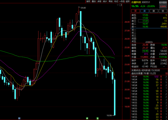 古鳌科技早间一直在略跌1%附近震荡,至午后开盘没多久,股价突然放量直线下挫,快速20%跌停,创8个月来新低。截至收盘,成交4.35亿元,较昨日增加1倍多,换手率9.07%。