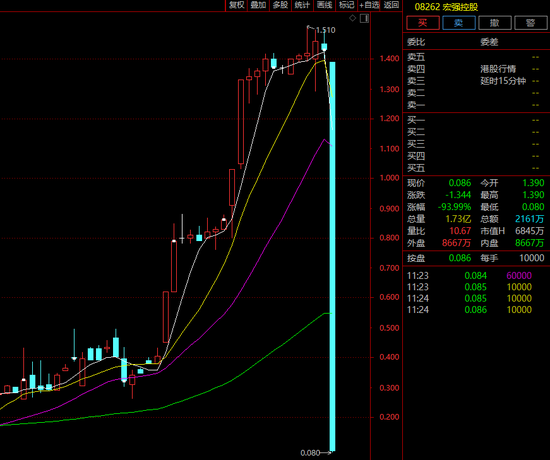 宏强控股更是暴跌93.99%,创历史新低,此前3个月,宏强控股由最低0.081港元,最高涨至1.51港元,大涨近18倍。