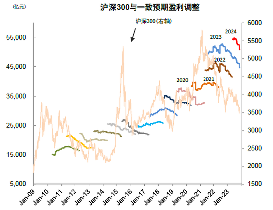2023年上市公司表观盈利增速受到疫后“疤痕效应”和物价因素影响,盈利预期下修幅度在历年相对较高可能也是今年市场表现平淡的原因之一。展望2024年,随着上市公司库存压力减轻,结构性过剩导致的盈利预期下调也已计入,我们认为上市公司盈利预期下调的风险已得到较多释放,未来需要重点关注盈利增长回升的弹性。