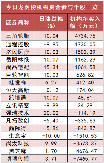 盘后龙虎榜数据显示,机构现身17股,其中三角轮胎等10股呈现机构资金净买入,博瑞传播等7股呈现机构资金净卖出。