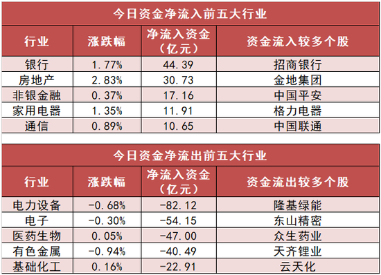 申万一级行业中,9个行业实现资金净流入,其中银行业净流入44.39亿元居首。