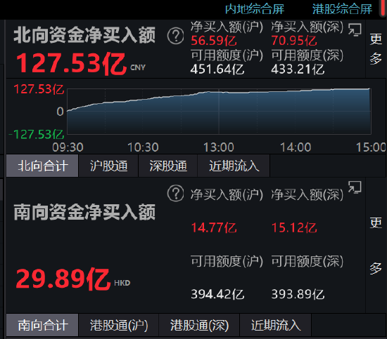 截至沪深股市收盘,北向资金全天单边净买入127.53亿元,创2022年11月14日以来新高;其中沪股通净买入56.59亿元,深股通净买入70.95亿元。