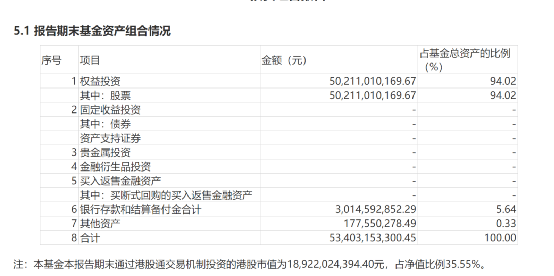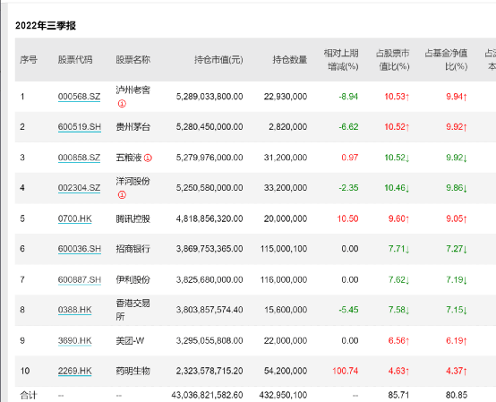 从张坤管理规模最大的易方达蓝筹精选来看,数据显示,该基金去年三季度末保持高仓位运作,仓位在94.02%,其中港股持有比例达到35.55%。前十大重仓股持有主要是泸州老窖、贵州茅台、五粮液、洋河股份等白酒股,此外,还持有腾讯控股、香港交易所、美团-W、药明生物等港股。