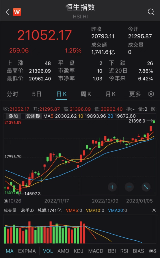 A股、港股自去年11月以来均迎来一波反弹。数据显示,恒生指数在2022年10月31日探底14597点之后,截至2023年1月5日收盘,恒生指数已经站上了21052点,两个多月来已涨超6000点。
