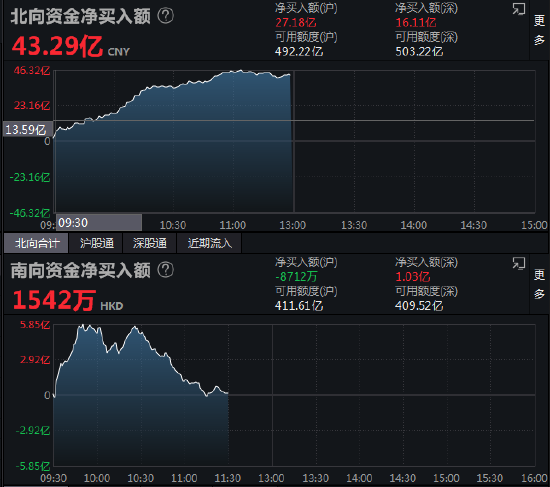午评:北向资金净买入43.29亿元 沪股通净买入27.18亿元