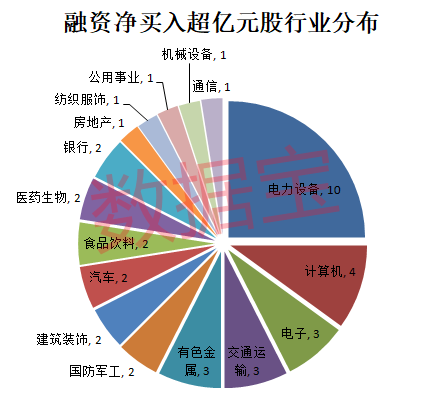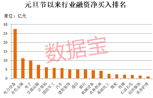 节后融资资金最青睐的股票都有谁?数据宝统计,元旦节以来共40股融资净买入逾亿元,从所属行业来看,来自电力设备、计算机、电子、交通运输、有色金属行业的股票数量较多。电力设备行业入围公司数量最多,共10家榜上有名,占总数的25%。