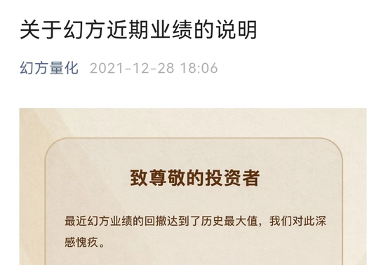 2021年11月15日,幻方量化公告封盘,公司暂停旗下全部产品的申购(含追加)。2021年12月28日,幻方量化在其微信公众号发布《关于幻方近期业绩的说明》,表示“最近幻方量化业绩的回撤达到了历史最大值,我们对此深感愧疚”。