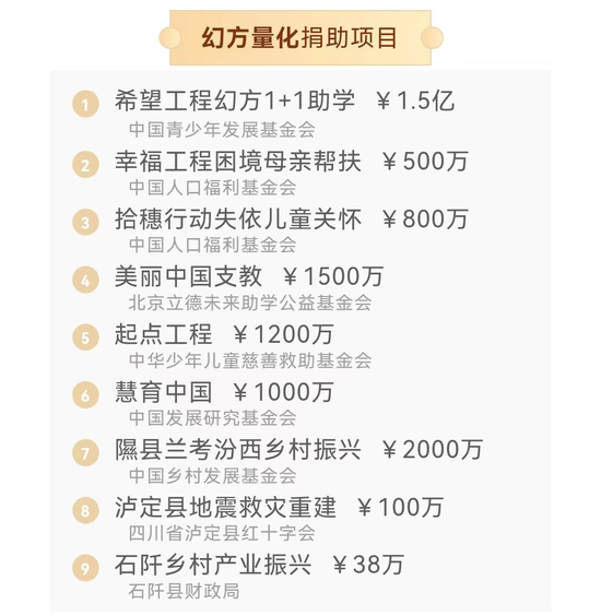 而据媒体报道,2021年,幻方量化就累计捐助人民币2.3亿元,为几百个欠发达地区和上万名儿童设立4个持续性的公益项目。也就是说,在2年时间里,幻方量化向慈善机构共计捐赠4.5138亿元。