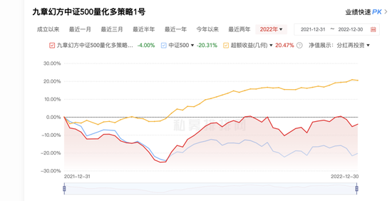 私募排排网的数据显示,截至2022年12月底,百亿私募数量为112家,其中有业绩展示的私募管理人为92家,2022年平均收益率为-7.16%;26家私募赚钱,正收益百亿私募占比26%。幻方量化以0.38%的正收益位列第24位。代表产品九章幻方中证500量化多策略1号2022年收益率-4%,超额收益率20.47%。