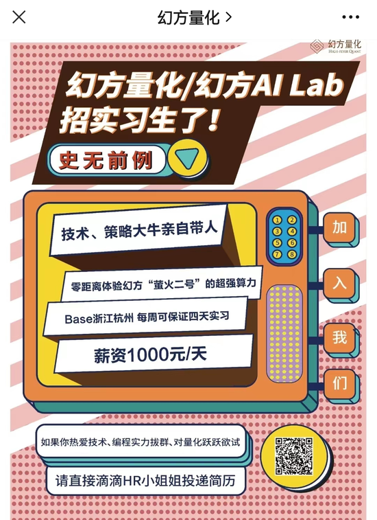 值得一提的是,2021年,幻方量化还曾日薪千元招聘实习生。据招聘通知显示,实习生日薪1000元,每周可保证4天实习,而且工作地点不是在一线城市,而是杭州。对于实习生的要求,幻方并没有提特别多的标准,只要热爱技术、编程实力强、对量化投资感兴趣,即可投递简历。