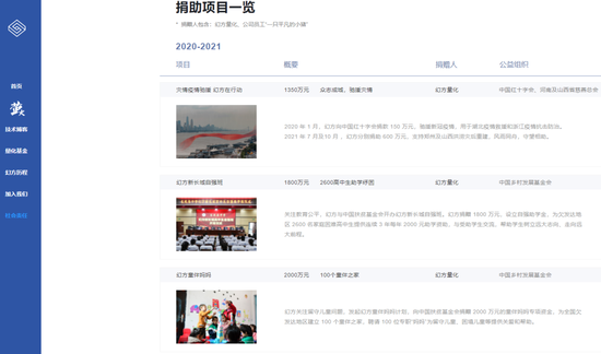 此外,幻方还在其官网上为社会责任开辟了专栏,详细介绍了其2020年至今的捐赠情况。其中2020年至2021年只捐赠了5个项目,2022年捐赠项目大幅增加。