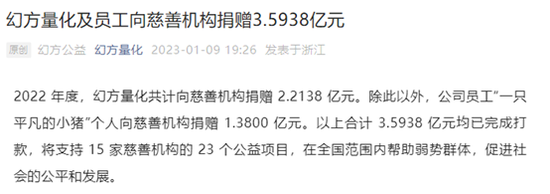 据悉,量化私募幻方量化日前发文称,2022年度,幻方量化共计向慈善机构捐赠2.2138亿元。除此以外,公司员工“一只平凡的小猪”个人向慈善机构捐赠1.38亿元。以上合计3.5938亿元均已完成打款,将支持15家慈善机构的23个公益项目。