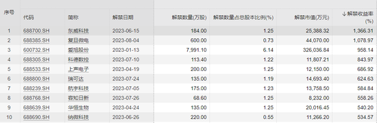 解禁收益率最高的个股也在6月以后出现,东威科技(688700.SH)6月15日解禁184万股,占总股本的1.25%,解禁市值约2.53亿元,这部分首发战略配售股份的解禁收益率为1366.31%。复旦微电(688385.SH)也将在8月4日解禁600万股,占总股本的0.73%,解禁收益率1078.97%。
